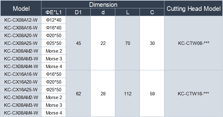 Internal Cutting Head Dimension Chart